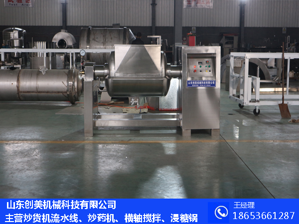 山東創(chuàng)美機(jī)械主要生產(chǎn)炒貨機(jī),炒貨機(jī)流水線,大型浸糖鍋,及橫軸攪拌炒鍋殺菌鍋等具體可咨詢客服